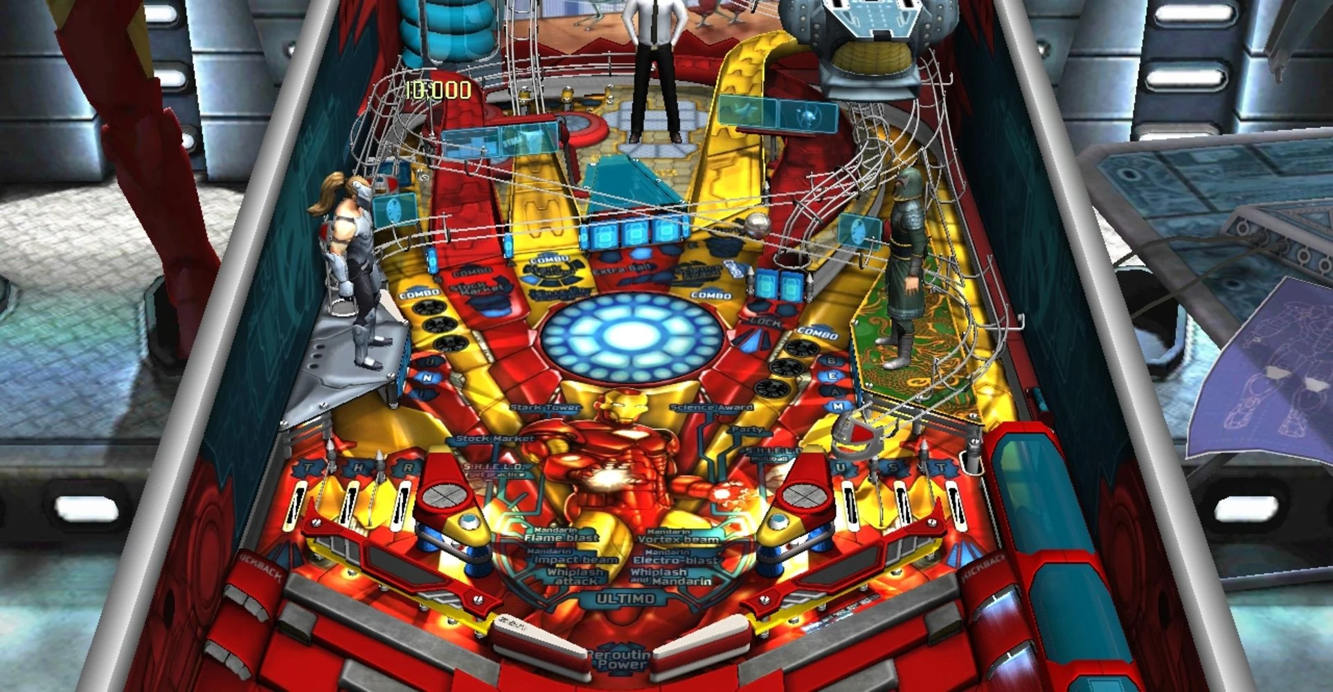 - Mandarin Electro Blast: The Mandarin has a powerful attack that can greatly disrupt Iron Man's armor systems - an electromagnetic blast from one of his rings. After the Mandarin zaps Iron Man with it and leaves him for dead, the player must reboot Iron Man's systems by shooting the left orbit, the yellow left ramp leading to Stark Tower and the red Science crossramp, then fully recharge the suit by hitting the bumpers many times within a 1 minute time limit, in which the orbits will divert the ball directly to the bumper area to make the recharging procedure easy. After enough energy is regained, Iron Man will return to the Mandarin and take him down.