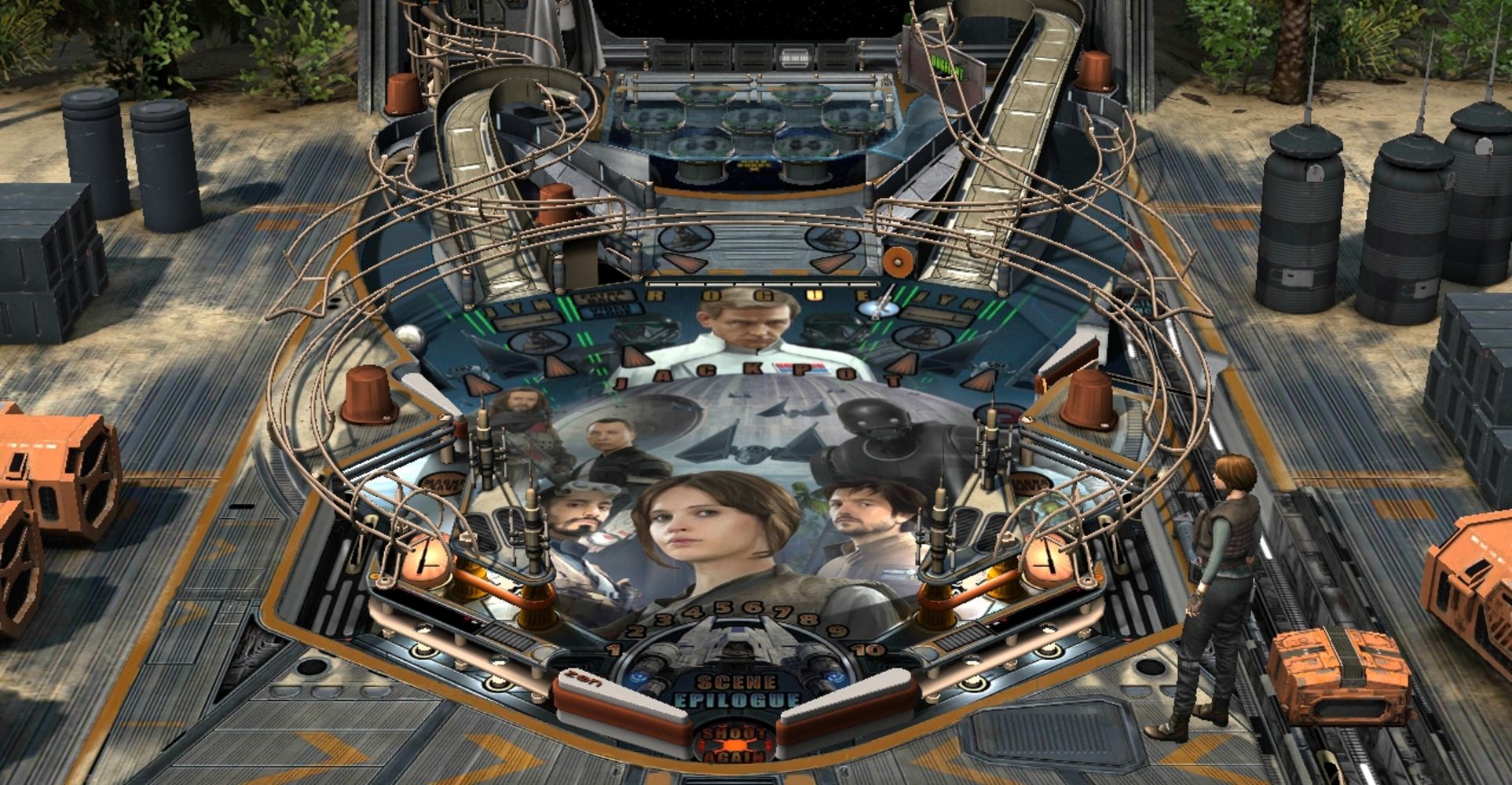 The entire table is designed to resemble the Imperial security complex on the planet Scarif, where the plans for the Death Star are being kept. The back wall of the table features a dynamic background that changes depending on the current mission. At the back left corner of the table is a slow-rotating spindisk where a figure of Director Orson Krennic, commissioned by the Empire to oversee the completion of the Death Star, stands. This spindisk bears the emblem of the Galactic Empire, is marked with the word LOCK lit up on the wall behind the spindisk and can divert balls to a small, thin screw-like cage, topped with the helmet of a Death Trooper, an elite Imperial soldier, where balls can be locked for multiball.